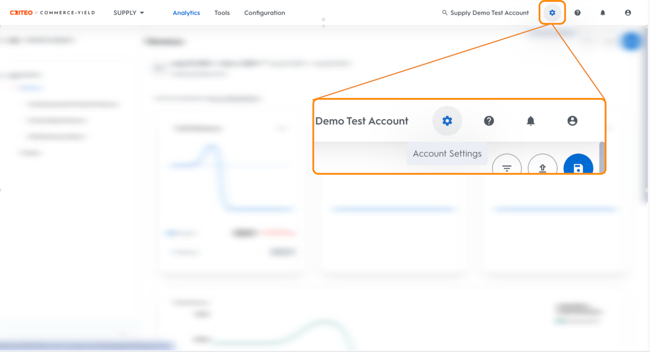 You can access your account settings by clicking on the Account Settings icon in the top right corner of the Commerce Yield Platform.