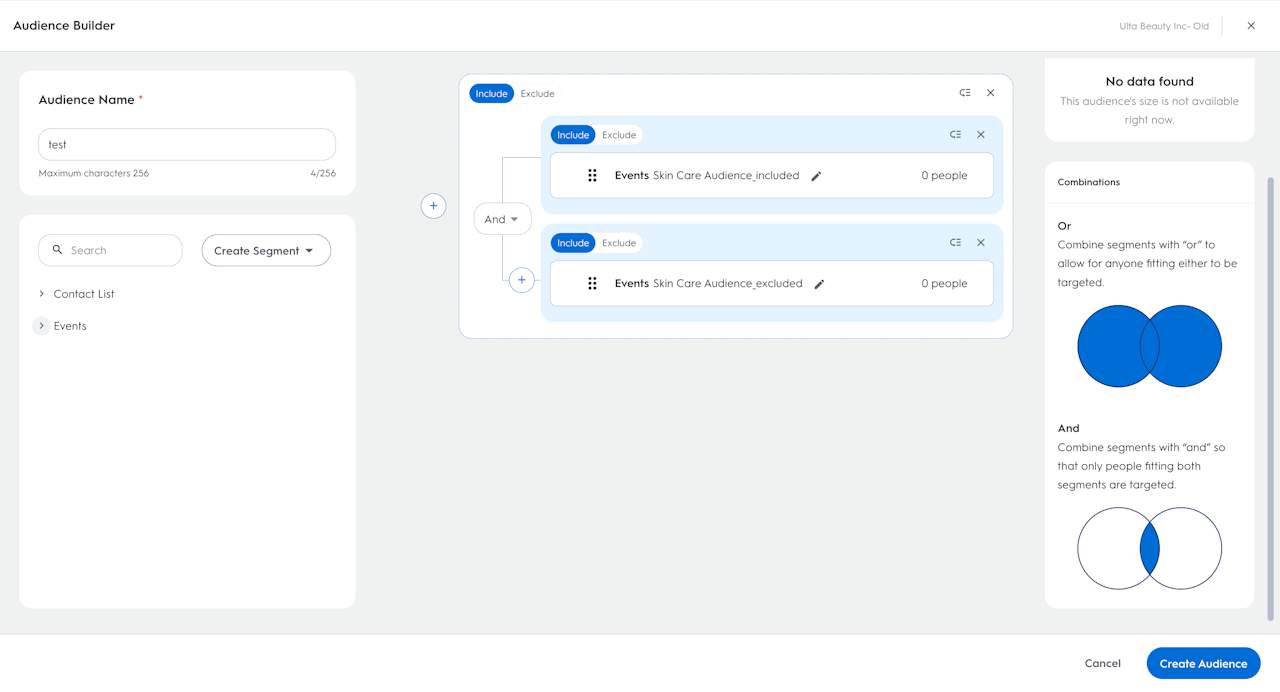 In Audience Builder, Events and Contact Lists can be mixed and matched, and combined with algebraic operations such as OR & AND, and Include & Exclude to create specific audiences to target in the campaigns.
