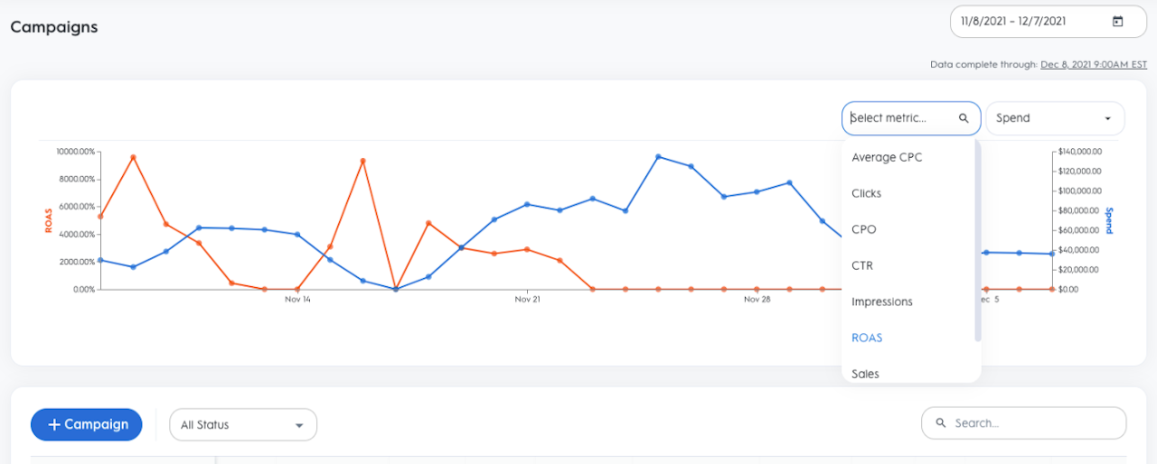 There are nine KPIs available for selection in the Campaign Dashboard: ROAS, Clicks, Average CPC, Average CPM, CTR, Impression, Sales, Spend, and Dates.
