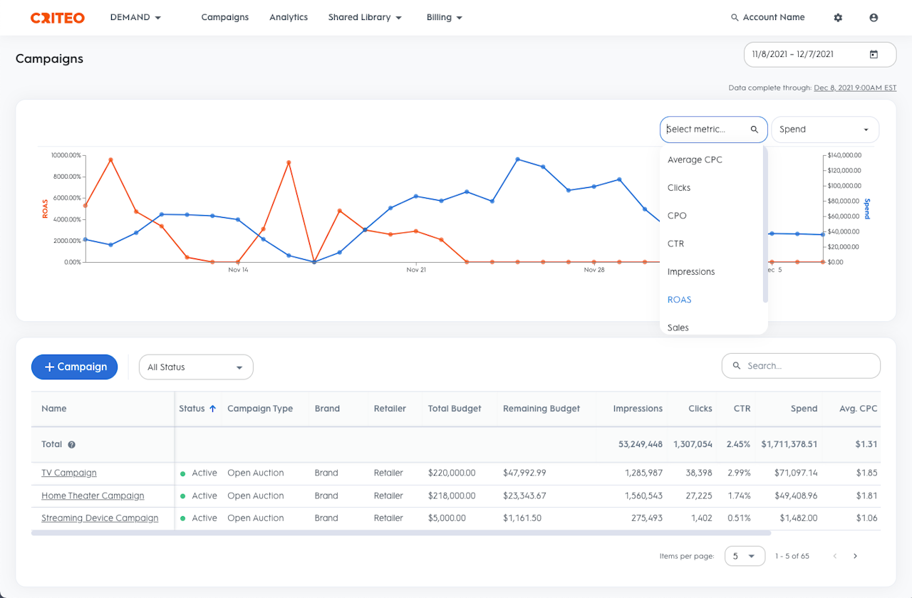 To get an in-depth analysis of the campaigns running on the account, you can also go to the Analytics section of the Demand side of the UI where you’ll find performance broken down by Campaign, Line Item, Product Brand, Product Category, Product, Page Type or Keyword etc.