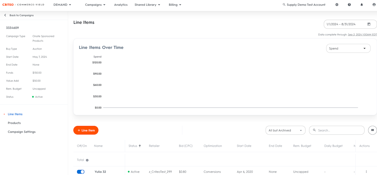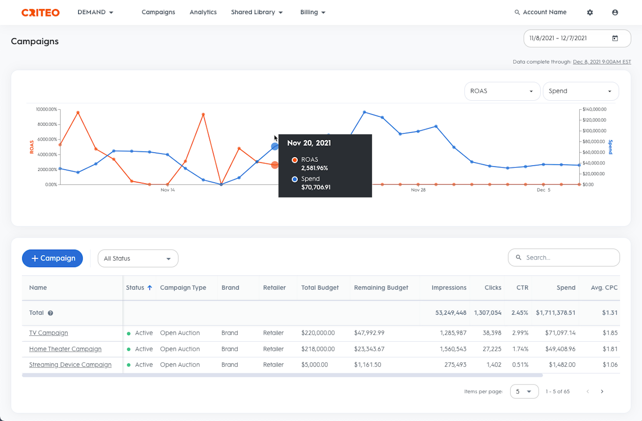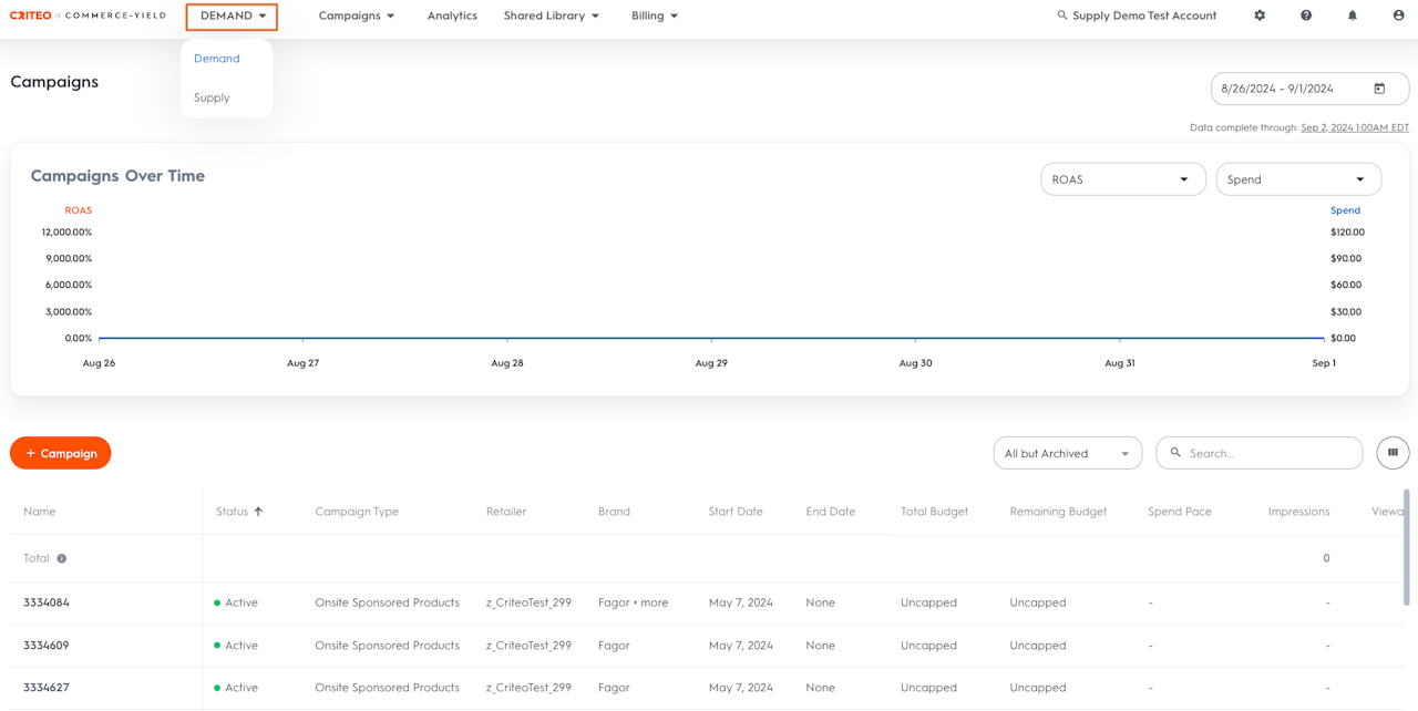 To get an in-depth analysis of the campaigns running on the account, you can also go to the Analytics section of the Demand side of the UI where you’ll find performance broken down by Campaign, Line Item, Product Brand, Product Category, Product, Page Type or Keyword etc.