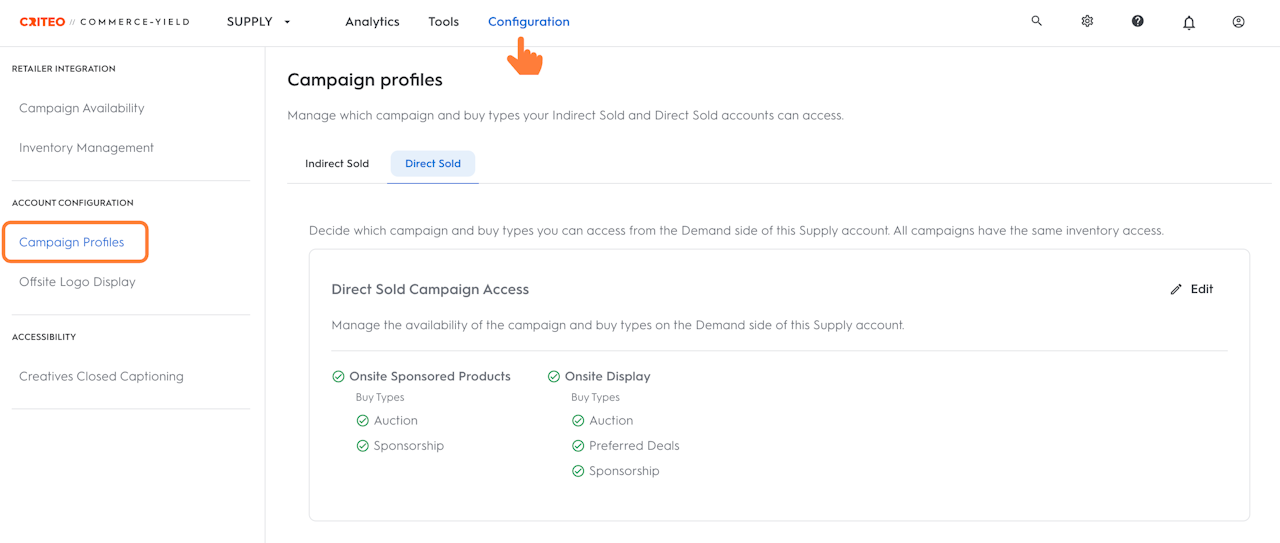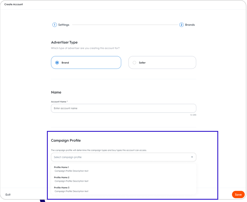 When a demand account (such as an advertiser or agency) is linked to a specific Campaign Profile, the permissions defined in that profile decide what the demand account can see and do. This ensures that only the intended campaign types and buy types are available to each demand account.