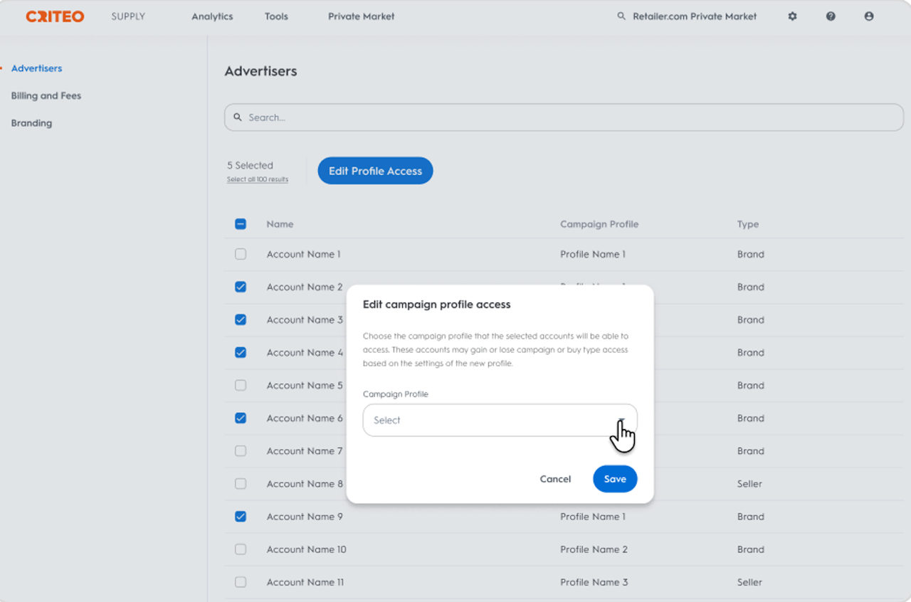 Precisely control what part of your inventory is available within each demand entry point. If you have launched a Private Market program, the profiles also allows you to precisely control what each advertiser account can access.