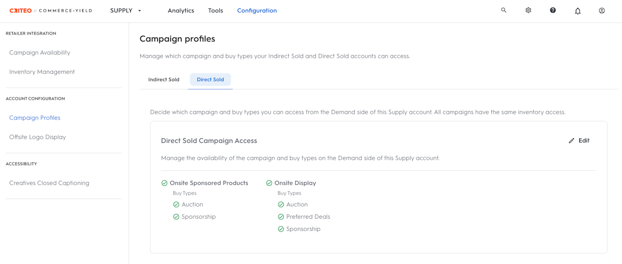 Retailer | Criteo and Retailer teams | When campaigns are managed by the retailer (or Criteo) | Indirect sold profile |