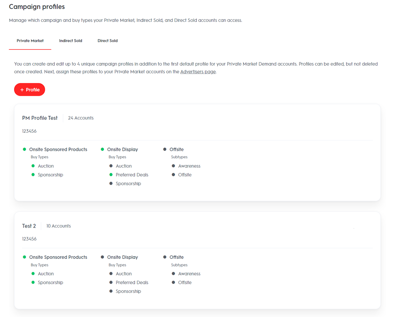 It helps you define access rules for different demand entry points. You will see three different subpages on the dashboard, where you can create up to six profiles - one unique indirect sold, one unique direct sold, and up to four private market profiles.