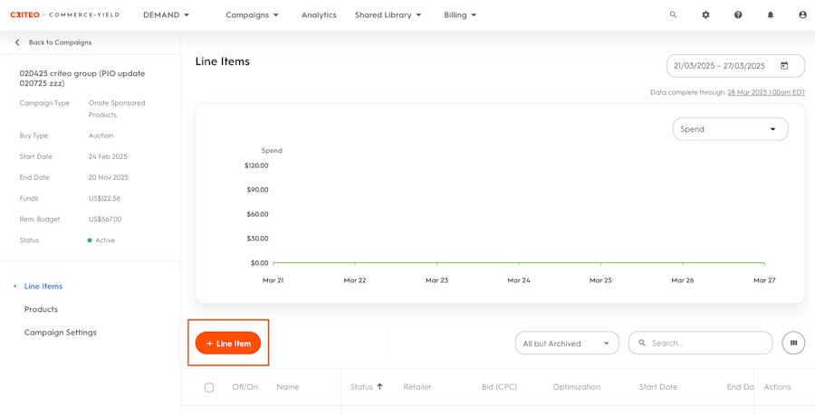 You are now on the Line Item Dashboard. Here you can see all line items that exist under this campaign, and you can add new ones.