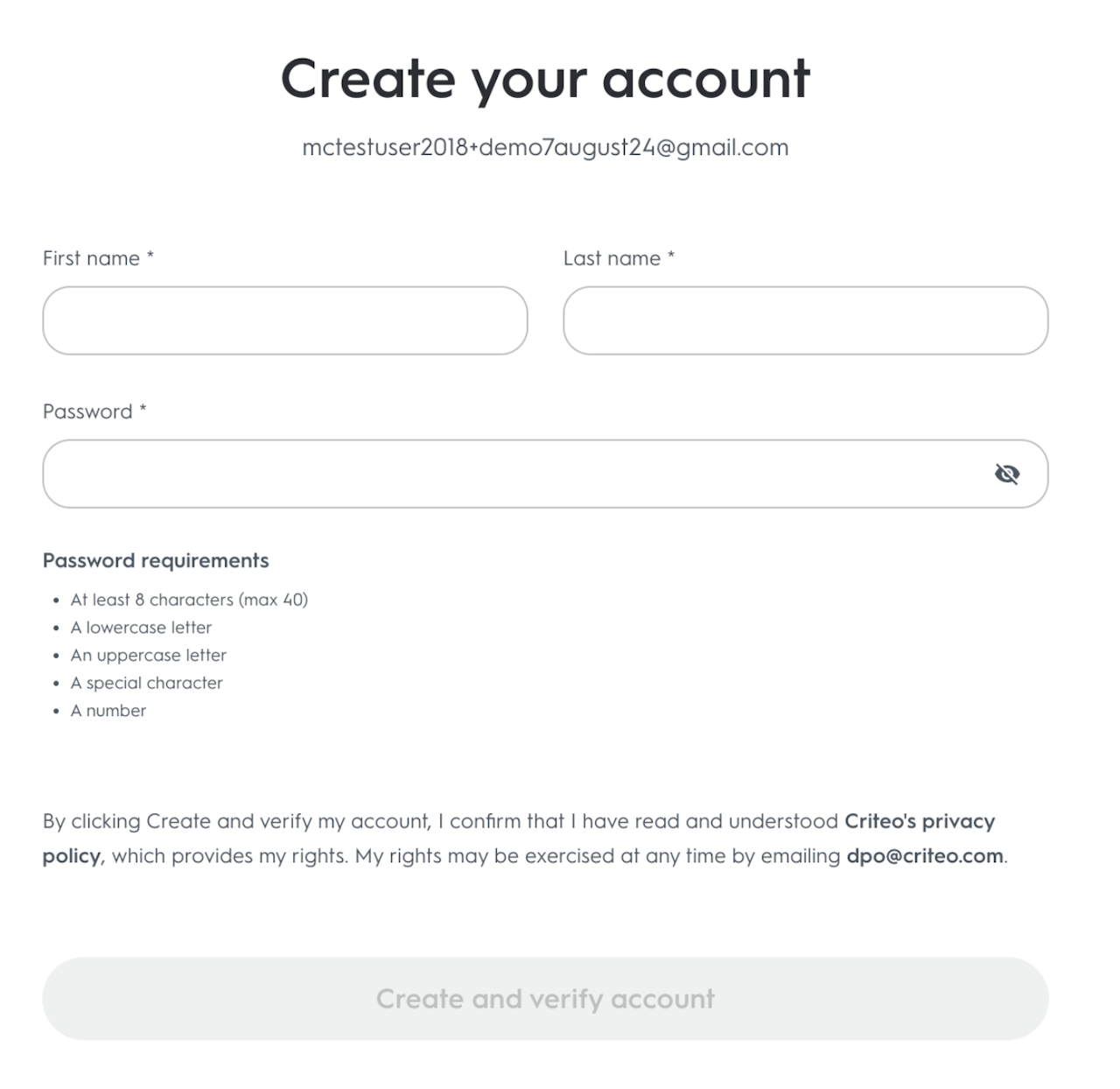 Fill out the Registration Form by entering your First Name and Last Name, and create a secure password that meets Criteo’s requirements.
