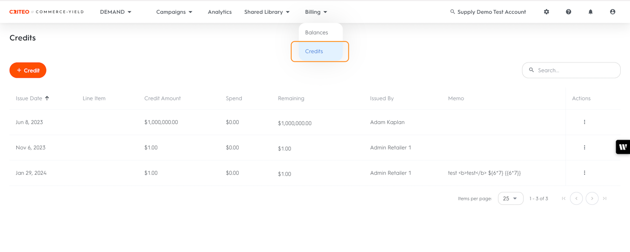 Line items with credits will spend from the credit first, before utilizing any other billable funds (e.g., existing balances).