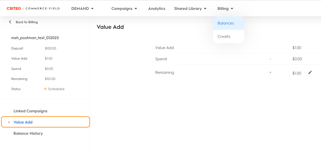 Value Adds are allocated to the overall balance and shared across all campaigns linked to that balance.