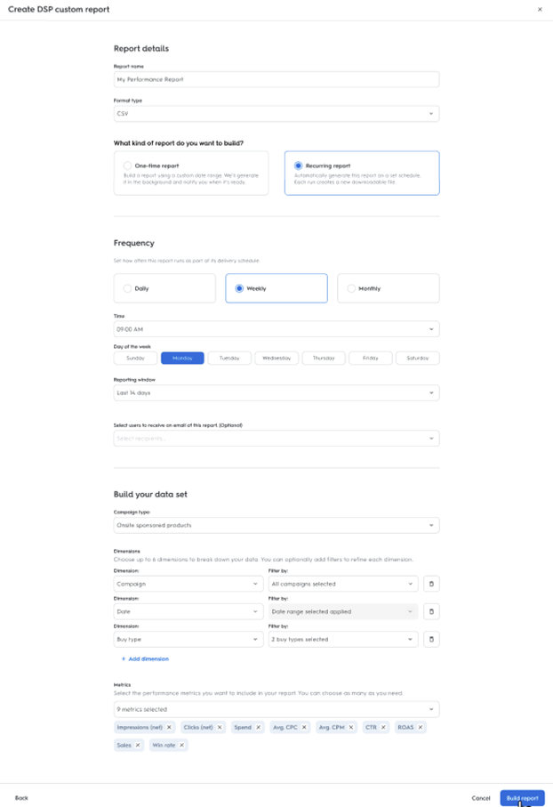 These reports give complete control over how the data is structured and delivered. Unlike standard reports, it lets you build your own dataset by choosing exactly which metrics, dimensions, and filters you want to include. This means every report can be tailored to your specific goals - whether you're analyzing performance, comparing trends, or pulling detailed breakdowns.