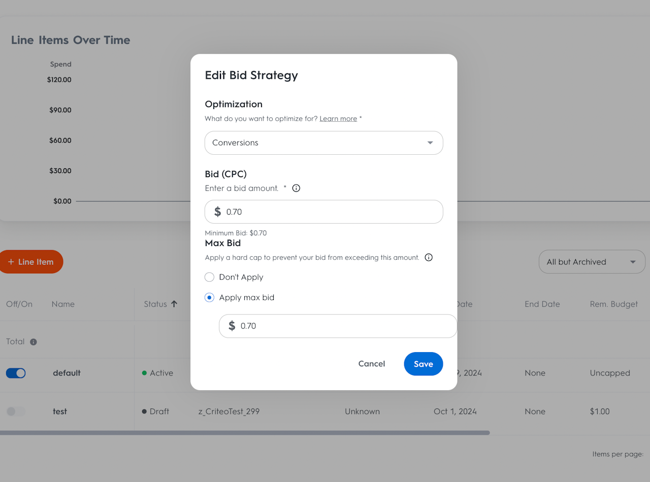 In the Line Items dashboard within the campaign, edit each line item’s CPC directly in the Bid (CPC) column by clicking the Edit icon displayed to the right of the existing bid when hovering over it. To modify the bid, enter the amount in the input field in the Edit Bid Strategy menu.