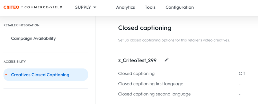 You can control whether closed captioning should be enabled for your advertisers through the Configuration dashboard under the Supply side of your account.