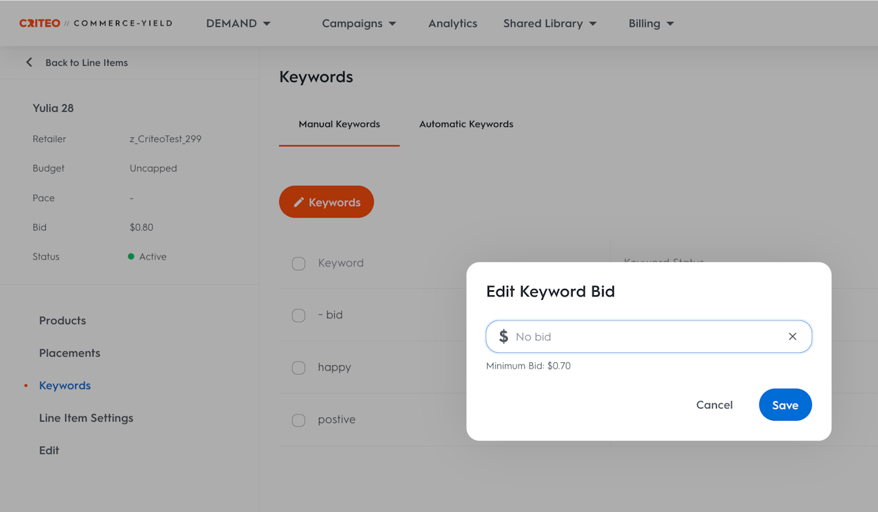 Set bid in the pop-out that appears. The keyword bid set must always respect the minimum bid of the line item, displayed below the entry field.