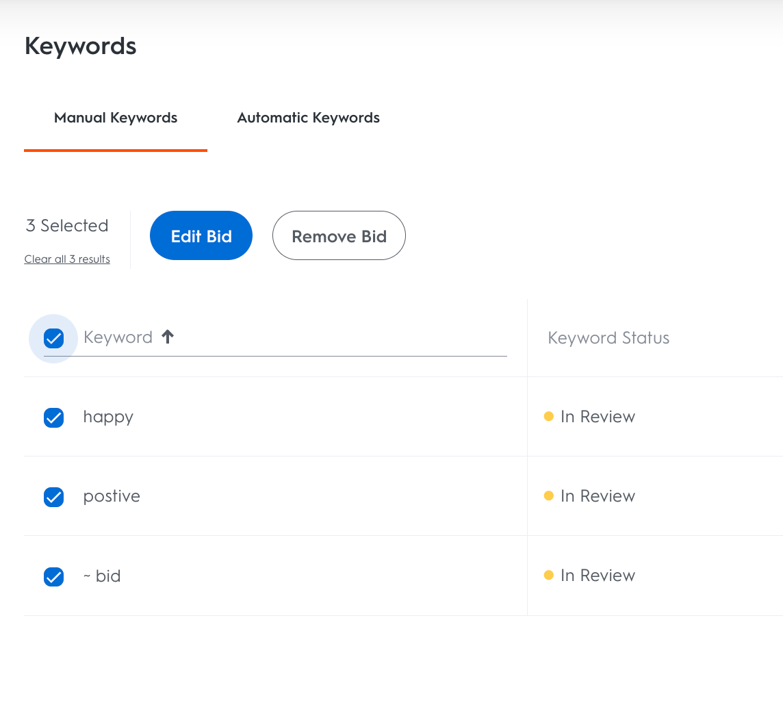 In both the Manual and Automatic tabs on the Keywords page, there is a Keyword Bid column where brands and advertisers can choose how much or little to bid for an individual keyword. To enter a keyword bid: