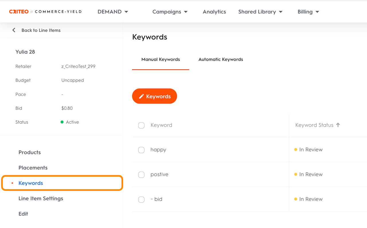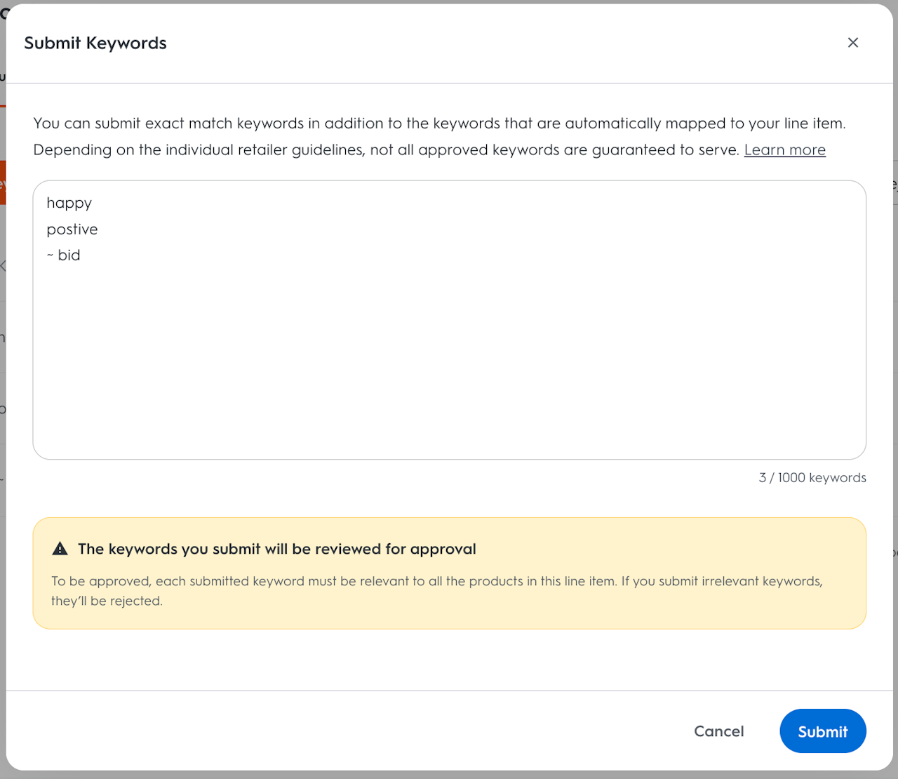 Brands and advertisers can submit positive keywords directly from the Keywords page as follows: