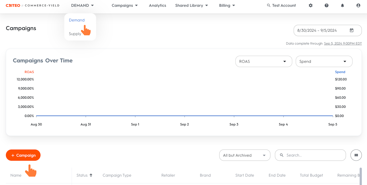 Click on the +Campaign button in the center-left of the screen.