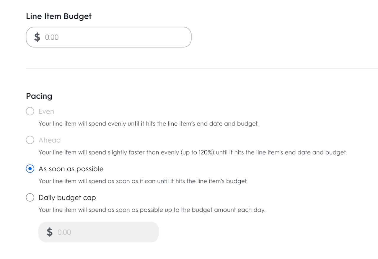 Enter the maximum amount for your line item to spend for the duration of your campaign. Setting a budget does not guarantee that your line item will spend the entire amount. The amount is used as an objective and your line item will stop delivering when it is reached.