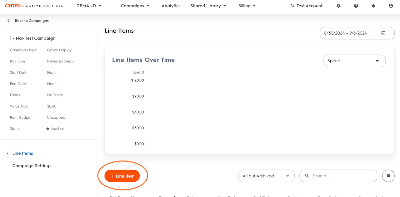 Click on the name of the campaign to which you want to add a Line Item.