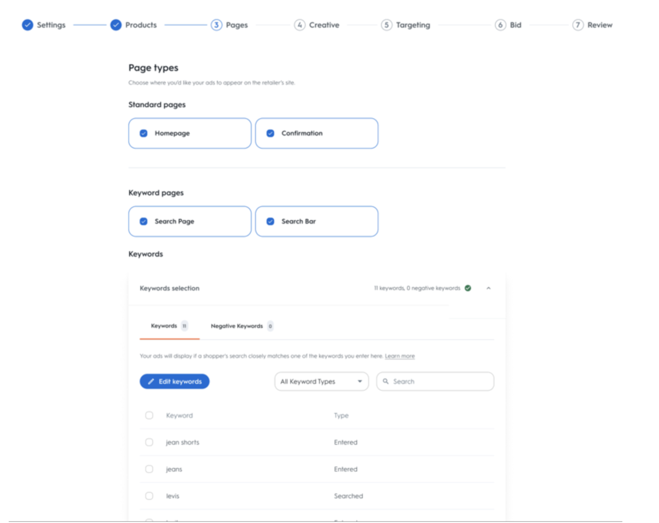 Page types listed are reflective of what is available for targeting based on the retailer selected in the first step of your line item creation.