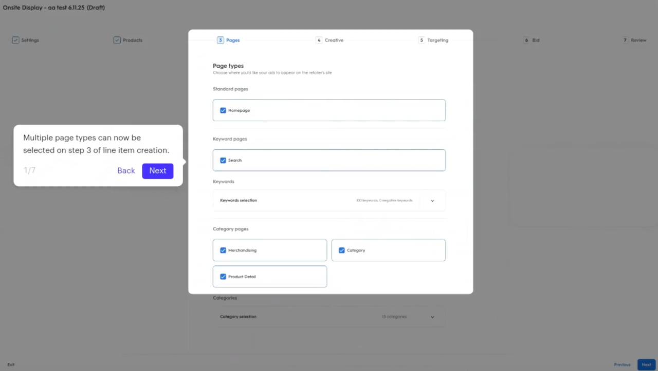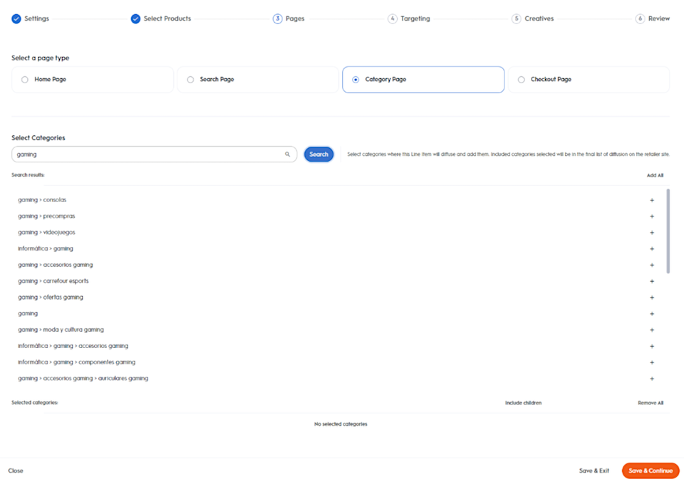 For Search, you can enter the keywords on which you want your line item to serve. For Category pages, you can select the categories on which you want your line item to serve.