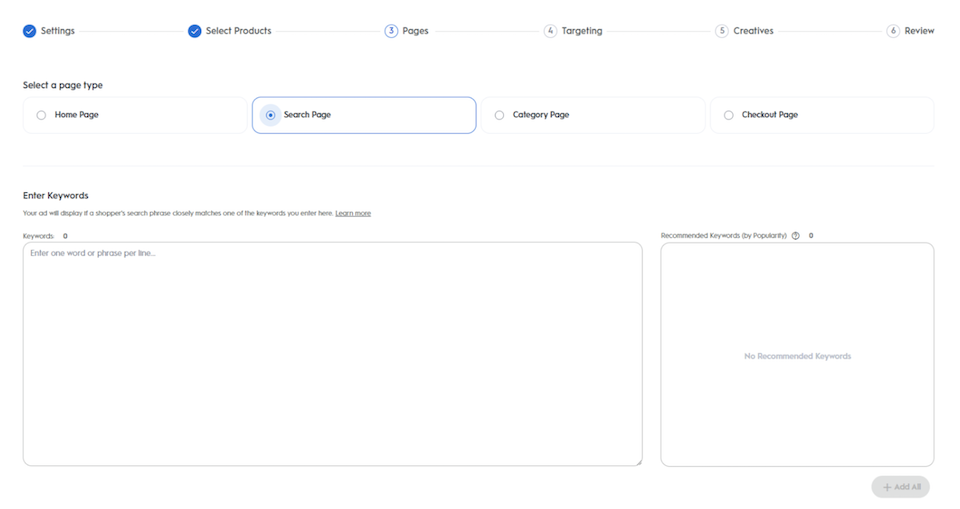 For certain page types like Search, Category, etc, you’ll also need to define targeting inputs, such as keywords.