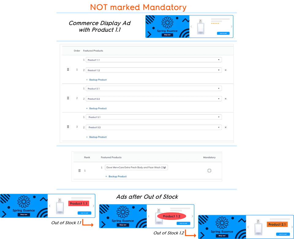 The user marks the Product Listing 1 as mandatory because they don’t want the ad to show if Product 1.1 or Product 1.2 are out of stock.