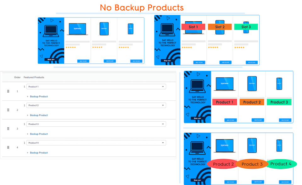 There are 3 product listings. Product 1.2 is a backup product in product listing 1. Product 2.2 is a backup product in product listing 2. Product 3.2 is a backup product in product listing 3.